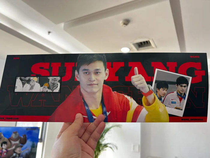 当天上午预赛,早在开赛前一个多小时,场外就已经集聚了大量来为孙杨加油打气的年轻女泳迷。当中有热心的粉丝,在为其他前来加油的同好们分发应援物料。