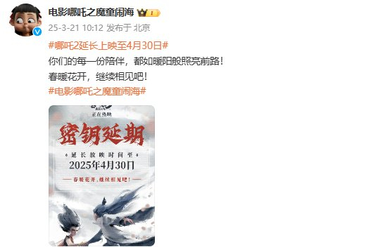 新京报讯 3月21日,电影《哪吒之魔童闹海》发博宣布延长上映至4月30日。