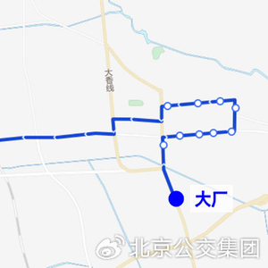 由大厂发出,经华安南路、大安西街、大安东街、康安路、北辰东街、北辰西街、华安北路、北新西街、大厂连接线、厂通路、福喜路、迎宾大道、蒋谭线、厂通路、潞城中路、胡郎路、春明西路、潞阳大街、畅和西路、运河东大街至东小营公交场站。