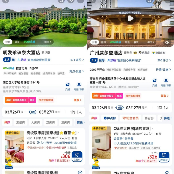 不过,在其他没有发放文旅补贴的地区,一些五星级酒店的房价确实比以前低了。红星资本局注意到,南京明发珍珠泉大酒店(曾在2011年被评为五星级酒店)、广州威尔登酒店(曾在2011年被评为五星级酒店)目前最低价格均在300元左右,这已经和中端连锁酒店的价格无异。