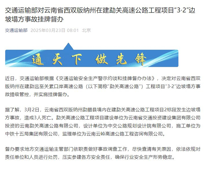 新京报讯 据交通运输部微信公众号消息,近日,交通运输部根据《交通运输安全生产警示约谈和挂牌督办办法》,决定对云南省西双版纳州在建勐远至关累口岸高速公路(以下简称“勐关高速公路”)工程项目“3·2”边坡塌方事故提级管控,并实施挂牌督办。