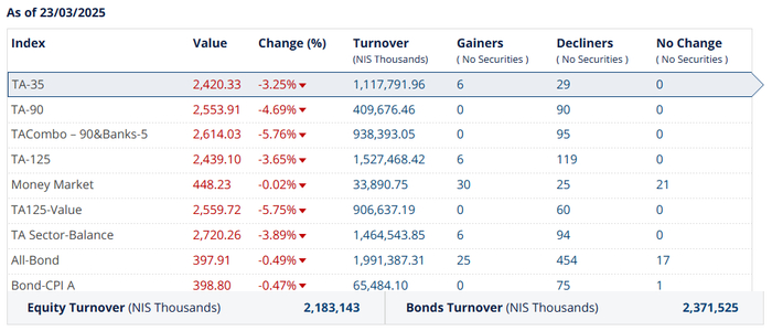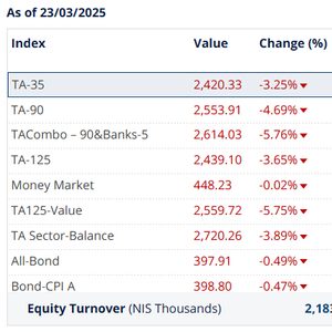 当日,基准指数TA 125指数收盘下跌超3.6%,蓝筹股公司指数TA 35指数下跌3.25%,追踪TA 35指数中未包括的最高市值股票的TA 90指数下跌4.69%。