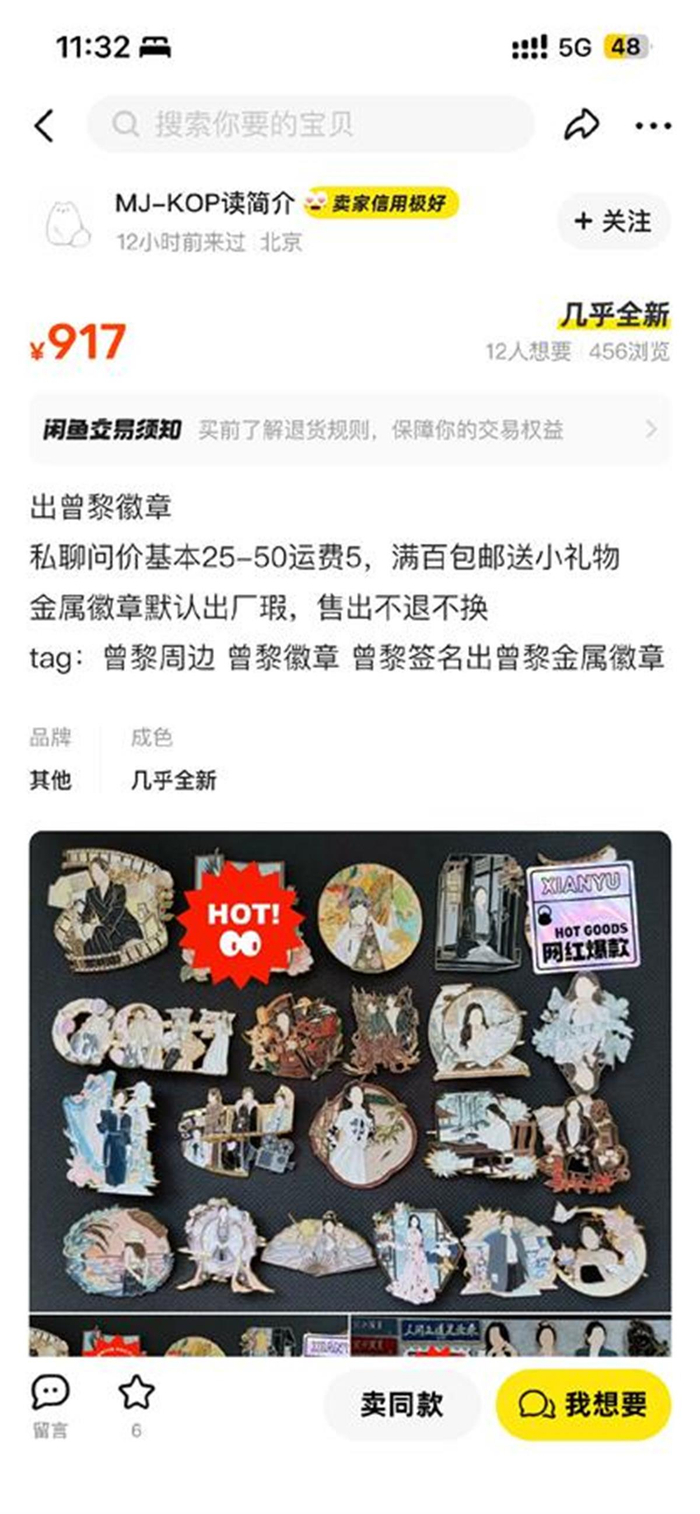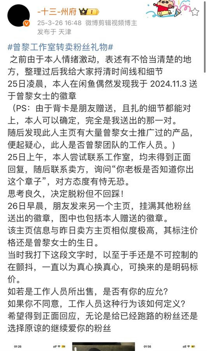 极目新闻记者注意到,名为“-十三-州府”的网友提到,3月25日凌晨,自己在二手购物平台偶然发现,自己在去年11月3日送给曾黎的徽章被挂在了这个平台售卖。随后,该网友因为发现卖家主页有大量曾黎推广过的产品,便怀疑卖家很可能是曾黎团队的工作人员。