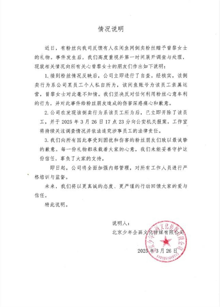 3月26日晚,曾黎工作室官方微博发布情况说明,表示接到粉丝反应后第一时间展开了调查,“倒卖行为系公司某员工个人私自所为,曾黎女士对此毫不知情,我们坚决反对任何利用粉丝心意牟利的行为,并对此次事件给粉丝朋友造成的伤害深感痛心和歉意。”