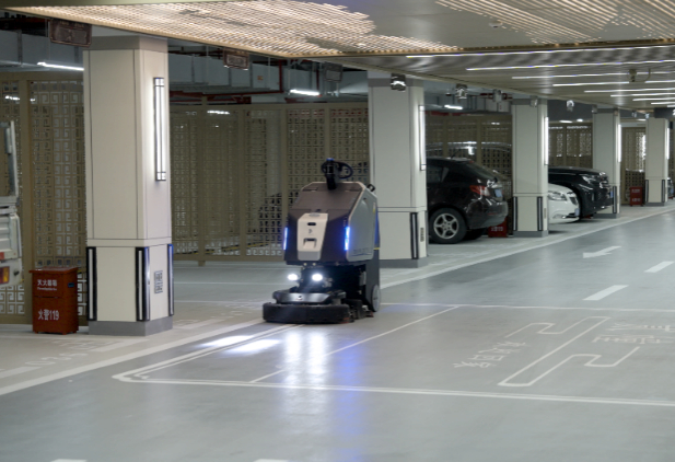 图:清洁机器人于厦建发五缘湾玺地库进行夜间清扫