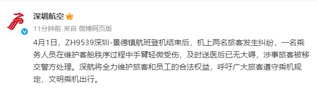 新京报讯 据@深圳航空微博消息,4月1日,ZH9539深圳-景德镇航班登机结束后,机上两名旅客发生纠纷,一名乘务人员在维护客舱秩序过程中手臂轻微受伤,及时送医后已无大碍,涉事旅客被移交警方处理。深航将全力维护旅客和员工的合法权益,呼吁广大旅客遵守乘机规定,文明乘机出行。