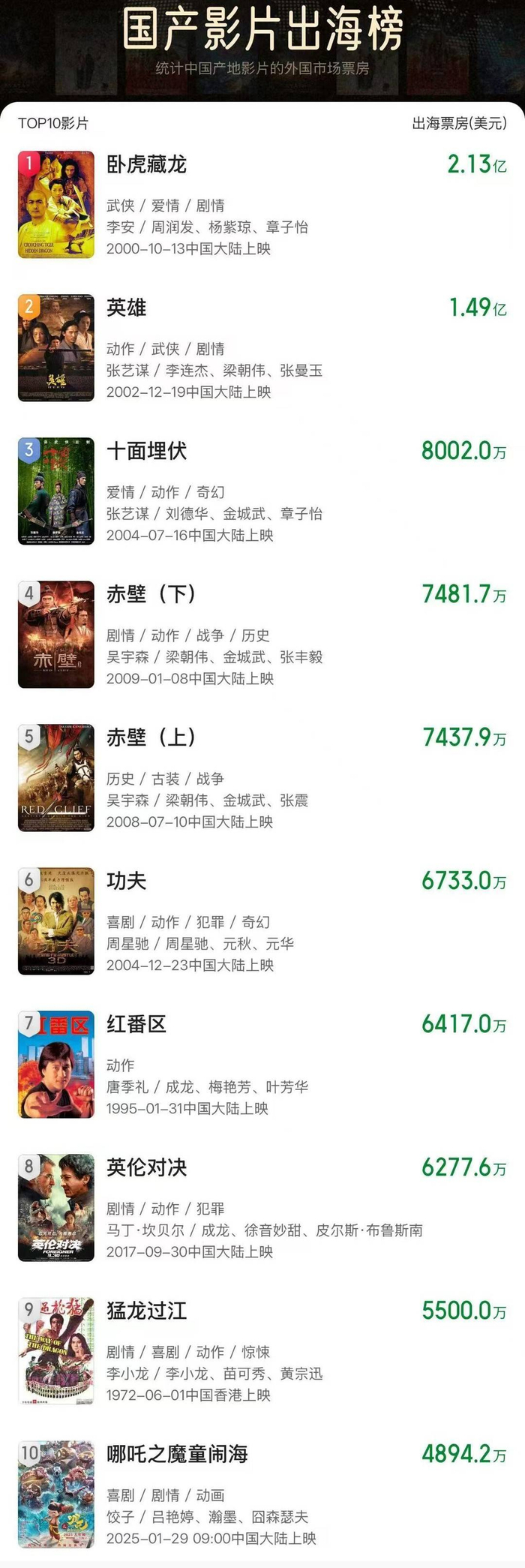 据网络平台数据,《哪吒之魔童闹海》出海票房超4894.2万美元,冲进国产电影出海榜前十!截至当前全球累计票房已达155亿,暂列全球影史票房榜前5!