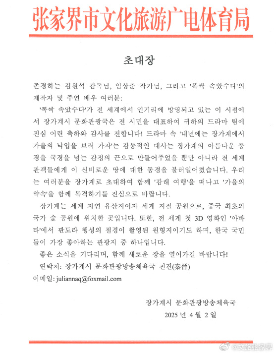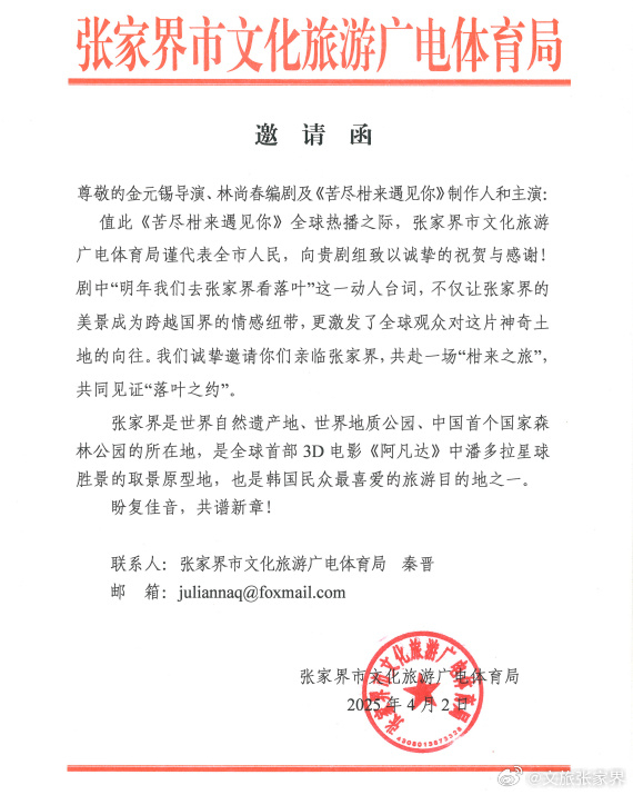 新京报讯 4月3日,张家界市文化旅游广电体育局发布邀请函,欢迎《苦尽柑来遇见你》剧组来张赴“落叶之约”。