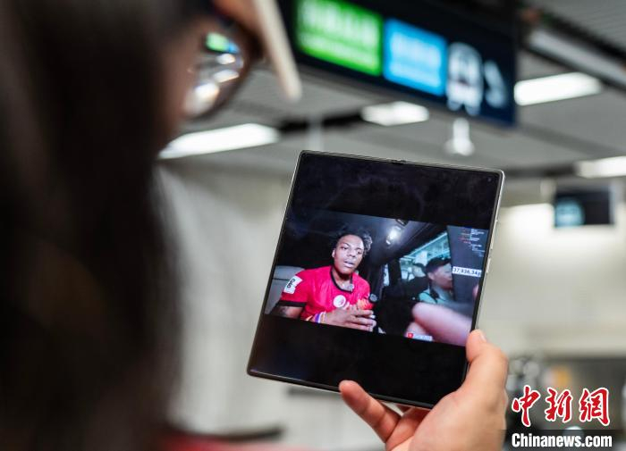 4月4日,美国网红IShowSpeed(中文昵称为“甲亢哥”)开启香港行,到访时代广场、香港海洋公园等地,引起香港市民关注。图为一位香港市民通过手机关注“甲亢哥”香港行直播。 中新社记者侯宇摄