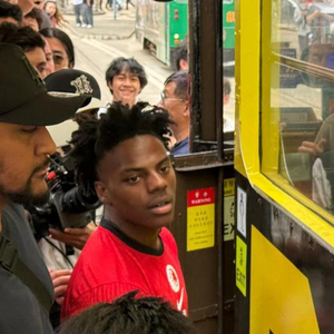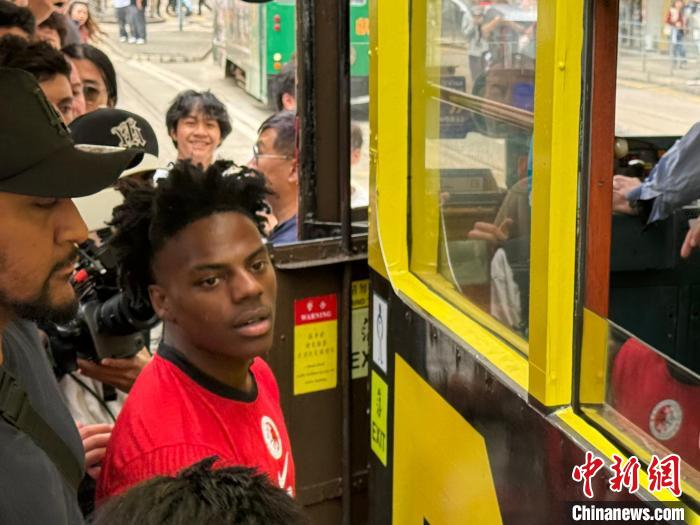 4月4日,美国网红IShowSpeed(中文昵称为“甲亢哥”)开启香港行,到访时代广场、香港海洋公园等地,并到茶餐厅用餐、乘坐电车游览香港景色,引起香港市民关注。图为“甲亢哥”(红衣)准备登上电车。 中新社记者李志华摄