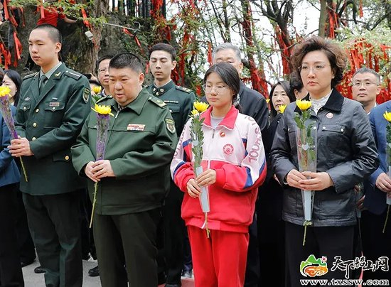 4月5日上午9点,毛新宇一行来到毛泽东广场,向毛泽东同志铜像敬献花篮。伴着庄严的《献花曲》,礼兵护送花篮摆放至铜像前。毛新宇上前仔细整理花篮绶带,全体人员向铜像三鞠躬,表达对一代伟人的无限敬意与缅怀。