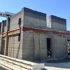 该建筑采用纯混凝土砂浆一体化打印墙体、楼板等部件,强度高于传统砖体。承重结构设计为“打印外壳 钢筋现浇”的混合模式:3D打印的承重柱外壳内预埋钢筋笼,与地圈梁焊接后浇筑混凝土,形成整体框架体系。这种设计既保留3D打印的高效性,又通过传统钢筋加固弥补纯混凝土抗拉性能不足的短板。项目技术负责人李洋波强调,裂纹仅出现在非承重墙表面,由高温施工环境导致水分蒸发过快引发,不影响主体安全。