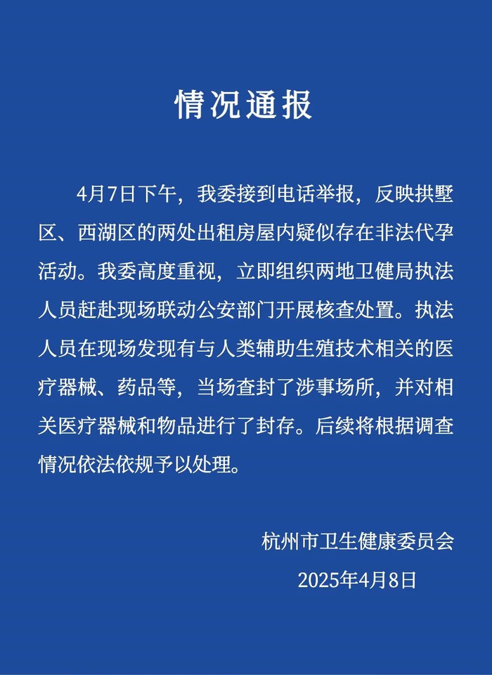 杭州市卫生健康委员会4月8日通报:4月7日下午,我委接到电话举报,反映拱墅区、西湖区的两处出租房屋内疑似存在非法代孕活动。我委高度重视,立即组织两地卫健局执法人员赶赴现场联动公安部门开展核查处置。执法人员在现场发现有与人类辅助生殖技术相关的医疗器械、药品等,当场查封了涉事场所,并对相关医疗器械和物品进行了封存。后续将根据调查情况依法依规予以处理。