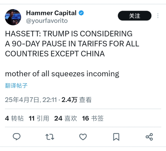 北京时间4月7日22:11,一个名为“Hammer Capital”(锤子资本)的未认证推特账号发布消息称:“美国国家经济委员会主任凯文·哈塞特表示,特朗普正考虑暂停实施新关税90天”。该账号仅有700余粉丝,内容却迅速被投资机构“T3 Live”转发(22:12),随后被拥有85万粉丝的账号“Walter Bloomberg”(22:13)以全大写新闻体扩散。尽管该账号与彭博社无关,但其长期模仿权威媒体的风格,使市场误以为消息来源可靠。