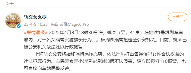 2025年4月8日18时30分许,姚某(男,41岁)在地铁1号线列车车厢内,对一名女乘客实施猥亵行为,后被周围乘客扭送至公安机关。目前,姚某已被公安机关依法处以行政拘留。