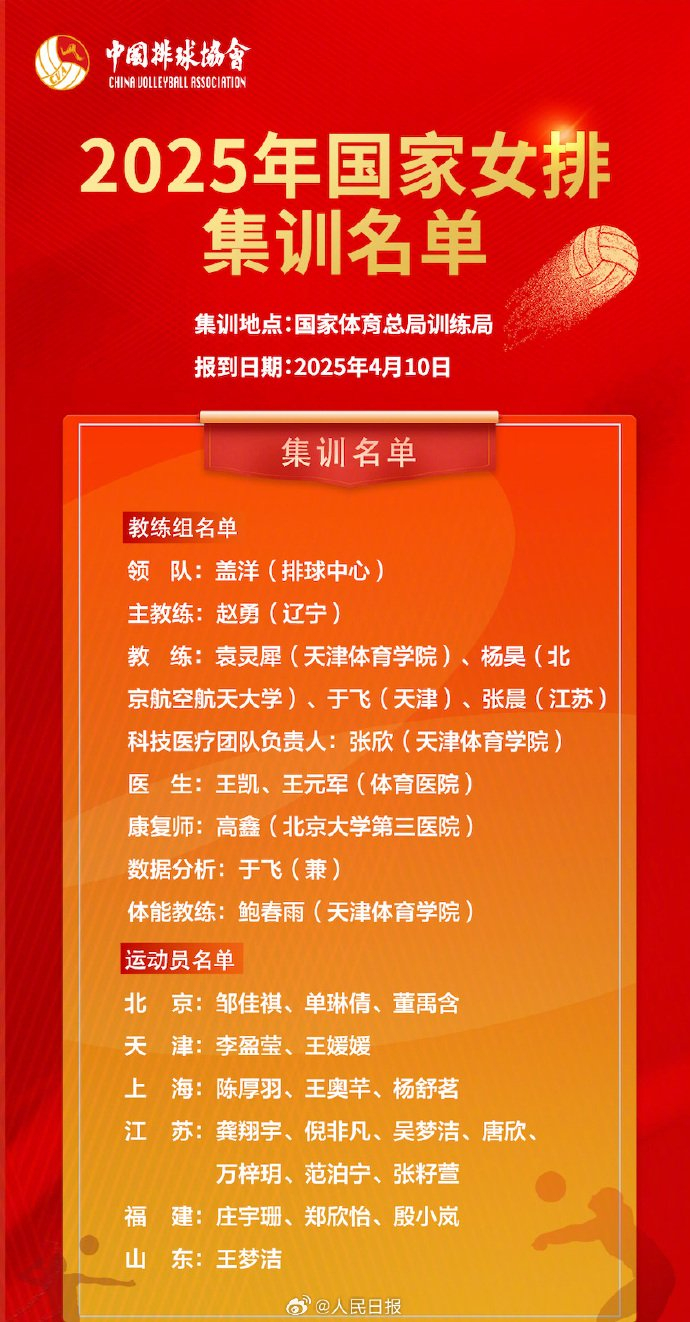据@人民日报 消息,4月10日,中国排球协会公布2025年国家女排集训名单。赵勇被选聘为新一届国家女排主教练。