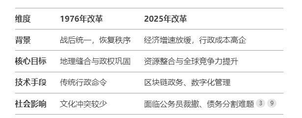 规模空前:两次均为全国性行政区划重构,1976年整合南北,2025年则聚焦经济效能。
