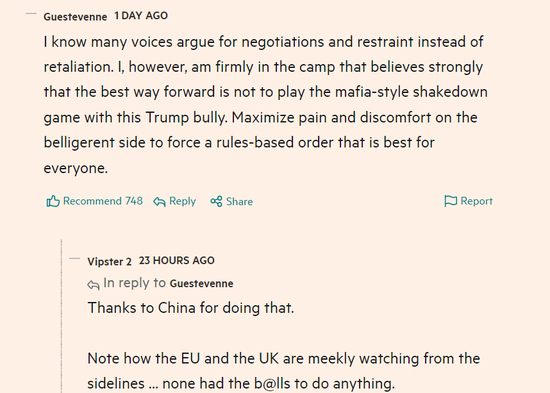 中国的严正立场也引发了同样受到美国关税影响的各国网民对中国的广泛支持。在英国《金融时报》相关报道评论区,获赞最多的一条网友评论称:“我知道有许多声音主张通过谈判和克制来解决问题,而不是采取反制行动。然而,我强烈认为最好的前进方式就是将好战一方的痛苦和不适最大化,如此才能建立一个对所有人都有利的基于规则的秩序。”