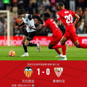 北京时间4月12日,西班牙足球甲级联赛第31轮,瓦伦西亚主场迎战塞维利亚。比赛中,瓦伦西亚凭借哈维-格拉的进球取得领先。最终,瓦伦西亚1-0战胜塞维利亚。