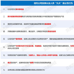 值得关注的是,《办法》将信托公司注册资本最低限额从3亿元提升至5亿元,同时强化了信托公司资本和拨备管理,此外还明确列出信托公司及其从业人员九大禁止性行为。