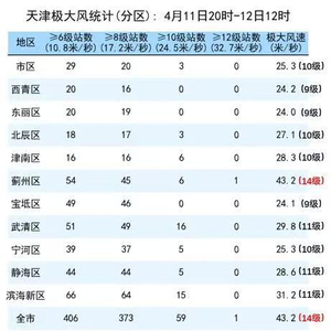 据微信公众号“天津气象”4月12日12时许消息,截至4月12日12时,天津全市出现西北风6~7级阵风10~12级,个别站14级,最大阵风43.2米/秒(14级,蓟州区盘山),突破1951年以来历史同期极值。