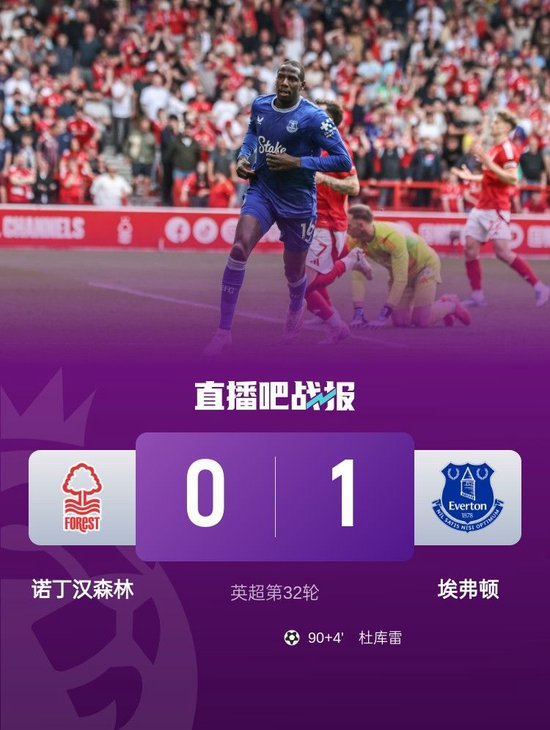 直播吧4月12日讯 北京时间4月12日晚上22:00,英超第32轮,诺丁汉森林坐镇城市体育场迎战埃弗顿。上半场,双方贫攻场面沉闷。下半场,杜库雷94分钟绝杀。全场结束,诺丁汉森林0-1埃弗顿。本场过后,森林积57分继续排名第三,埃弗顿积38分升至第十四。