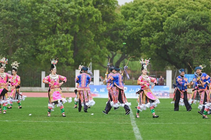“村超加油!交大加油!”赛场上,“村超”球员以灵活穿插展现黔地足球的野性活力,上海交大队员则凭借精准传控体系演绎战术素养,攻防转换间尽显团队默契与执行力。中场休息时,列入人类非物质文化遗产代表作名录的侗族大歌《天地人间充满爱》、榕江县国家级非物质文化遗产苗族芦笙舞《卓给者》让在场观众沉浸式体验了非遗文化盛宴,将竞技场化作了文化交融的舞台。