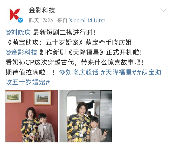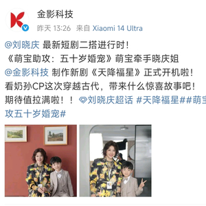 4月12日,北京金影科技有限公司通过其社交媒体账号对外官宣,刘晓庆出演的新短剧《天降福星》正式开拍,随后,刘晓庆也在其社交媒体上同步了这一信息。官宣信息显示,该剧为古装穿越题材,刘晓庆将在剧中与《萌宝助攻:五十岁婚宠》中的“萌宝”进行“二搭”。