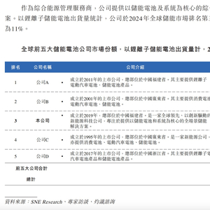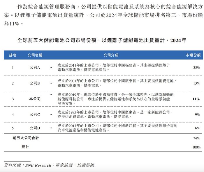 招股书称,全球储能行业的市场集中度较高,且行业竞争持续加剧。以锂离子储能电池出货量统计,前五大储能电池公司的市场份额于2024年达到了74%。作为综合能源管理服务商,公司提供以储能电池及系统为核心的综合能源解决方案。以锂离子储能电池出货量统计,公司于2024年全球储能市场排名第三,市场份额为11%。根据公开资料,前两名很可能是宁德时代(300750.SZ)和亿纬锂能(300014.SZ)。