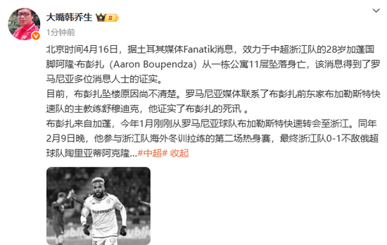 据知名足球解说韩乔生,4月16日,据土耳其媒体Fanatik消息,效力于中超浙江队的28岁加蓬国脚阿隆·布彭扎(Aaron Boupendza)从一栋公寓11层坠落身亡,该消息得到了罗马尼亚多位消息人士的证实。