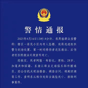 经核实,死者阿隆·布彭扎,男性,28岁,加蓬共和国籍,系浙江职业足球俱乐部外援球员。经公安机关现场勘查、调查访问、视频回溯等工作,查明系从租住处阳台高坠死亡,排除刑事案件。