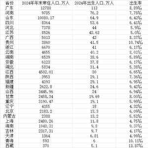 表:29个省份2024年年末常住人口、2024年出生人口及出生率