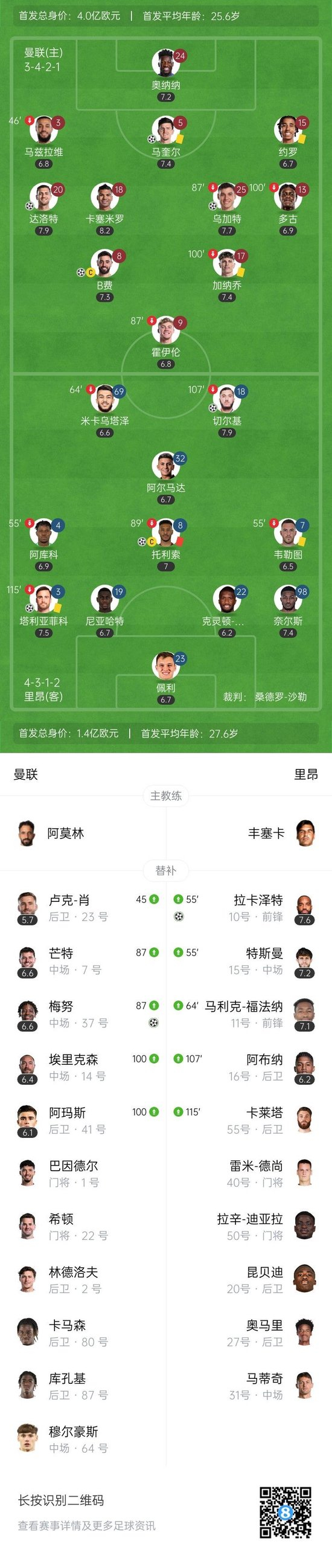 第71分钟,里昂前场右侧任意球机会,球传入禁区,第一点被解围,随后里昂球员连续头球接力,最终拉卡泽特助攻托利索头球破门,里昂1-2曼联,总比分3-4。↓