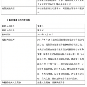 4月23日,海富通基金管理有限公司(简称“海富通基金”)公告称,路颖因工作调整离任董事长,国泰海通证券股份有限公司(简称“国泰海通证券”)副总裁谢乐斌兼任公司董事长一职,任职日期为2025年4月21日。