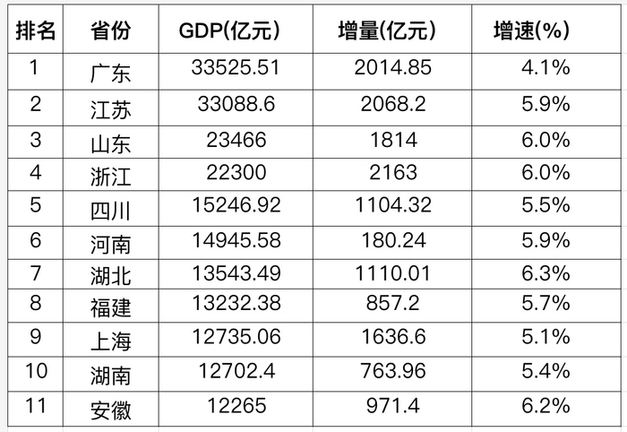 山东、浙江、湖北、安徽是经济大省中GDP增速在6.0%以上(含)的省份,增速分别达6.0%、6.0%、6.3%、6.2%。