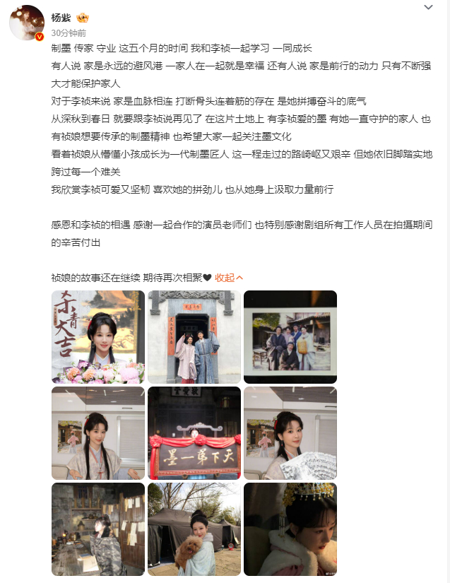《家业》杀青,杨紫发文告别:我欣赏李祯可爱又坚韧,也从她身上汲取力量前行