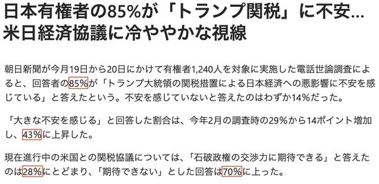 另据日本《朝日新闻》19日至20日进行的民调,多达85%的日本受访者担忧特朗普政府的关税会对日本经济产生负面影响,其中43%的受访者表示非常担忧。