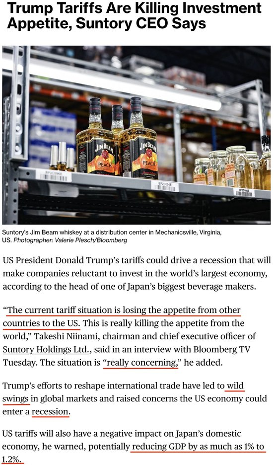 日本首相办公室高级经济顾问、日本最大饮料制造商之一三得利公司董事长兼首席执行官新浪刚史22日接受彭博社采访时警告,美国的关税措施已导致全球市场剧烈波动,可能引发美国经济衰退,并削弱其他国家对美国的投资意愿。