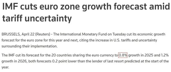根据国际货币基金组织22日发布的最新一期《世界经济展望报告》,受美国关税措施冲击和政策不确定性的影响,今年欧元区经济增长率预计将比之前下调0.2个百分点至0.8%。