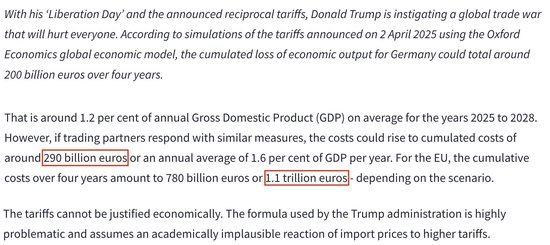 德国经济研究所日前发布的研究报告显示,未来四年内,美国“对等关税”措施可能令欧盟损失1.1万亿欧元,仅德国就将损失2900亿欧元。
