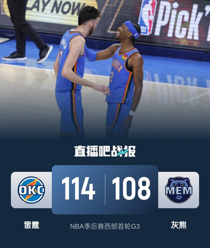 直播吧4月25日讯 NBA季后赛首轮G3,灰熊回到主场对阵雷霆。前两场比赛,雷霆在主场都以绝对优势拿下胜利,两场合计净胜70分。