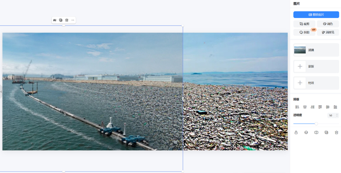 至于特朗普发布的第三张图,其实是一张后期合成的图片。图片的左半部分是美联社照片,展示的是在美国加州阿拉米达组装的用于收集太平洋塑料垃圾的一种浮动围栏装置,此图片曾在2019年被华尔街日报引用。