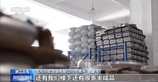 义乌市欧洛德有限公司负责人 黎雄飞:加了关税之后,我们货物的成本其实就相当于翻了两三倍。因为这个原因,导致我们这里将近三四千平方米的仓库,至少一半以上的货物都是滞留,我们楼下还有很多半成品,损失还是蛮大的。