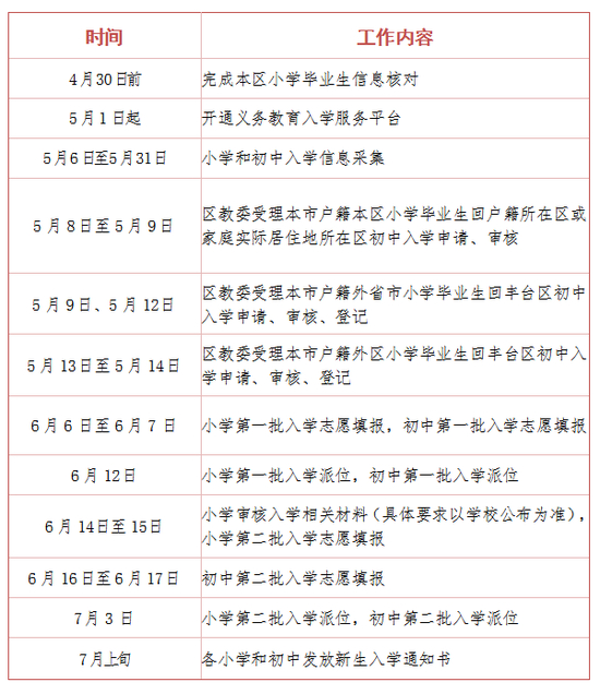 丰台区2025年义务教育阶段入学工作时间表