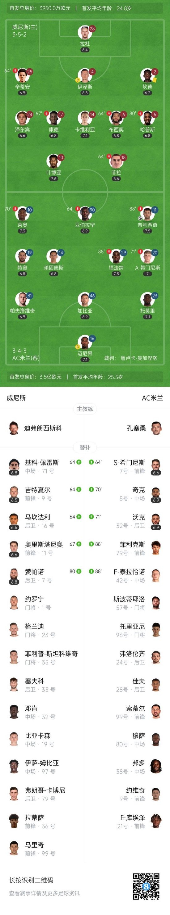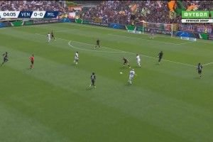 第90+6分钟,赖因德斯突然发动长传,S-希门尼斯禁区内挑射得手,AC米兰2-0威尼斯。↓