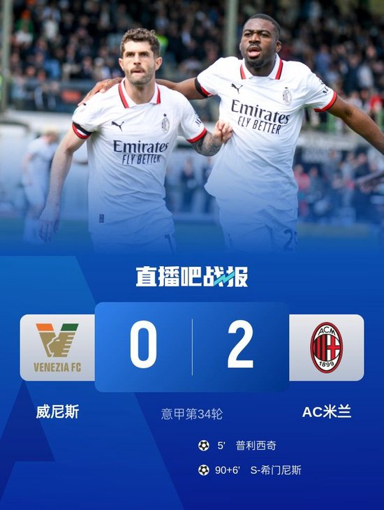 直播吧4月27日讯 北京时间4月27日18:30,2024-25赛季意甲联赛第34轮,AC米兰做客皮埃路易吉-彭佐体育场对阵威尼斯。上半场福法纳助攻普利西奇破门,叶博亚进球被吹,AC米兰暂1-0威尼斯;下半场S-希门尼斯补时建功,最终AC米兰2-0战胜威尼斯,距欧冠区6分。