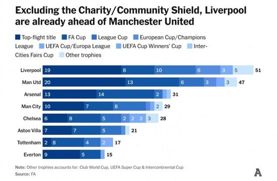 但曼联持有异议。红魔将社区盾计入重要奖杯(21比16领先)。按此标准,利物浦的英格兰顶级联赛第20冠将使双方68比68战平。关于社区盾是否属“重要荣誉”的争论持续数十年:弗格森(率曼联十夺该奖)等视其为季前热身赛。但该奖项在1974年前赛制混乱(曼联已获7次,利物浦3次),更遑论欧洲超级杯、世俱杯等是否入列的争议。若剔除这些,利物浦将以46比44领先。