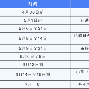 根据时间安排,5月6日至31日完成小学和初中入学信息采集工作,5月9日至31日审核非本市户籍适龄儿童少年接受义务教育材料,6月14日至15日前,小学(含培智学校)审核北京市户籍(含按本市户籍对待)适龄儿童入学相关材料,7月上旬发放新生入学通知书。