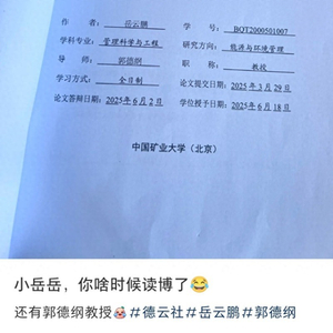 网上流传的截图显示,该博士学位论文题目为《中国交通行业温室气体排放的影响机制与情景预测研究》,作者为岳云鹏,导师则为郭德纲,学科专业是管理科学与工程,学习方式为全日制,并附上了学号以及论文提交、答辩日期等,下方还标注有学校为中国矿业大学(北京)。