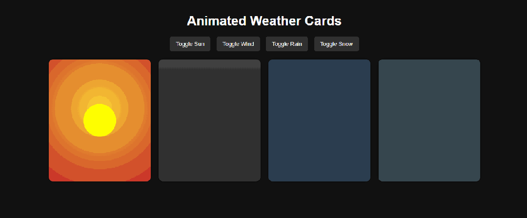 Create a single HTML file containing CSS and JavaScript to generate an animated weather card。 The card should visually represent the following weather conditions with distinct animations: Wind: (e.g。, moving clouds, swaying trees, or wind lines) Rain: (e.g。, falling raindrops, puddles forming) Sun: (e.g。, shining rays, bright background) Snow: (e.g。, falling snowflakes, snow accumulating) Show all the weather card side by side The card should have a dark background。 Provide all the HTML, CSS, and JavaScript code within this single file。 The JavaScript should include a way to switch between the different weather conditions (e.g。, a function or a set of buttons) to demonstrate the animations for each。